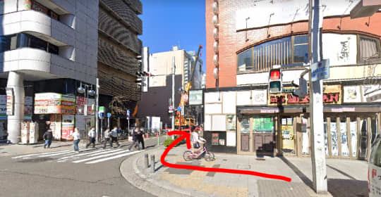 ここを右へ曲がり、数十メートル歩いたら向かって左側のビルです。