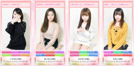 スレンダー系、ミニマム系、巨乳系などスタイルもさまざまなので、アナタ好みの女の子を見つけてください。新人の女の子は割引がありますので、ウブな女の子好きな方は狙い目ですよ!