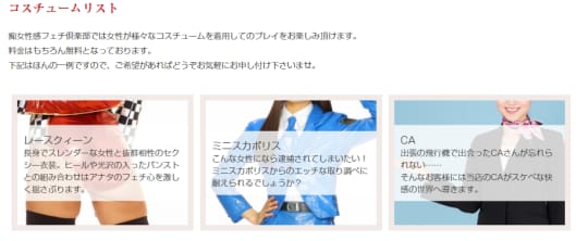 こちらは、自分だけのオリジナルストーリーをリアルにプレイすることが可能で、事前打ち合わせも可能、完全アドリブも可能です。女性が個人的に用意しているコスプレも、各女性のプロフィールのアイテム画像で確認できます(便利)。