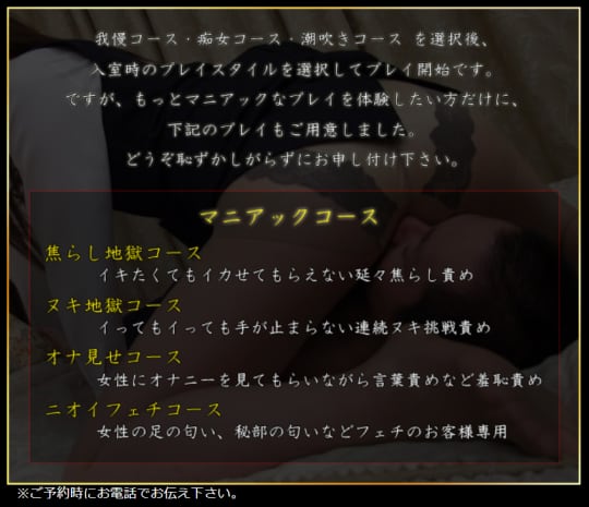 こちらのコースは、これまでご紹介した、女性が終始ランジェリー着用「男の潮吹き我慢コース」、女性が終始オールヌード「男の潮吹き痴女コース」に分かれています。