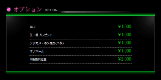 メンズエステには珍しいオプションとして「無料:コスチューム4種」「1,000円:電マ・生下着プレゼント・デジカメ撮影(写メ)2枚・オナホール」「2,000円:M性感前立腺」があります。