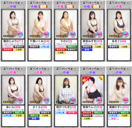 初心者向けボリュームのお肉ちゃんから、メガトン級肉塊ちゃんまで多くのおデブが集っています。