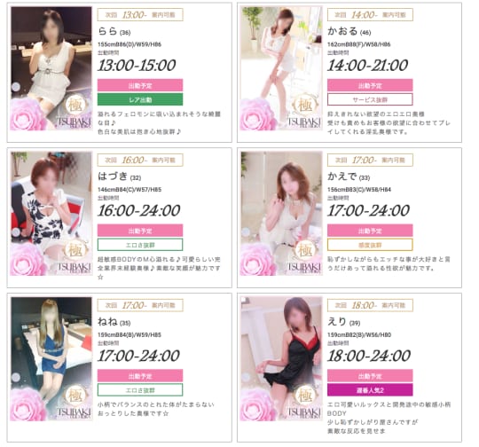 TSUBAKI(ツバキ)の女の子の全体的な印象はキレイ系が多いように思います。30代なかばの奥さまが中心なので、エロに関しては特に期待できそうです。スタイルはモデル体型〜ムチムチ系まで、幅広く在籍してますので、好みに合わせて指名するといいと思います!