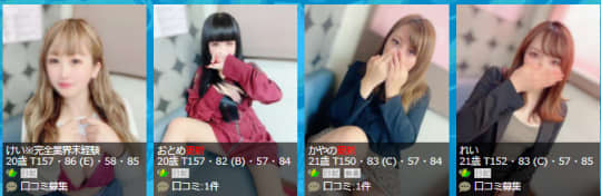 さまざまなジャンルの女性が在籍しており、「業界未経験の素人」「巨乳」「綺麗なお姉さん」「スレンダー美女」「会話の楽しい女性」「ポッチャリ系」「エロい女性」「ドMな女性」「Sの女性」など充実したラインナップです。