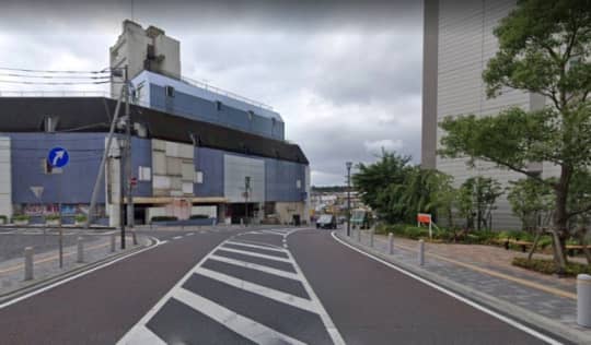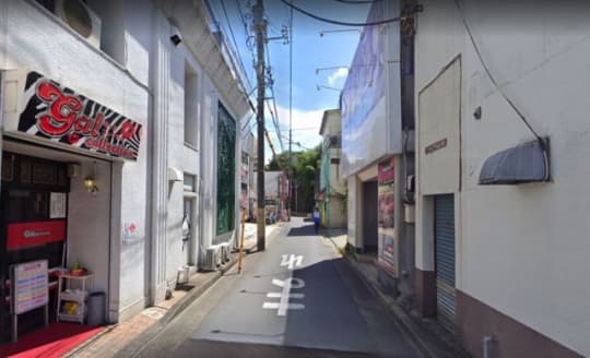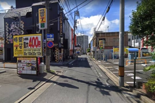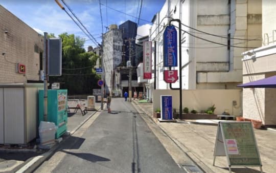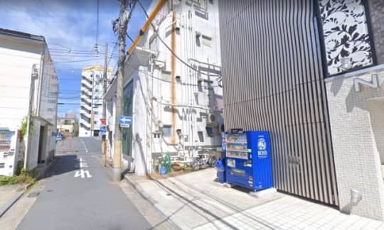 青色の自販機があるところがハピネスです。そして道路標識の止まれの文字がある地点から、左側の建物がファッションヘルスのYESグループ、右側にギャルコレクションが目印としてあります。