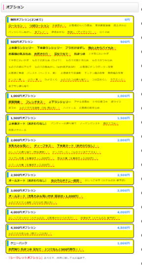 500円オプションは「上半身ランジェリー」「下半身ランジェリー」「ブラだけはずし」「服の上からパイもみ」「お客様の乳首なめ」「お尻さわり」「足なでなで」「抱きつき」「上半身においかぎ」「下半身においかぎ」「下半身においかぎ」「女の子の足なめ(ひざ下)」「女の子の耳と首なめ」「女の子のワキなめ」「女の子の頭なでなで」「女の子の服ぬがし(with脱ぎ系OP)」「お客様にピンクローター攻撃」「お客様に手枷」「パンスト(ベージュ、黒)」「お客様を写真撮影」「チンチン踏み攻撃」「顔面踏み攻撃」「ビンタ一発」「けり一発 」「ひざまくら」「女の子のつば持ち帰り」「つば口垂らし」「うでまくら」「歯ブラシ持ち帰り」です。