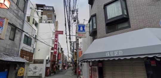 「大阪帝国ホテル」や「ヘルス・クラブリッチ」がある道の場合は、写真の十字路の道を右手に曲がるとルパンが見えてきます。