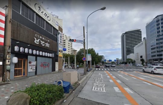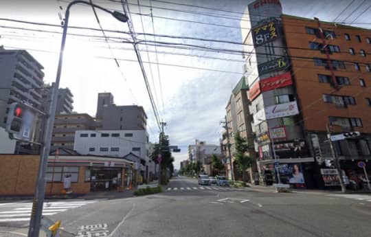 新栄町からなら、この写真の交差点を右に曲がって、まっすぐ進むと左手にソロモンが見えてくる。