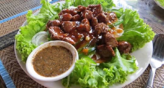 料理は西洋風が中心の多国籍。1品5ドルから10ドル程度です。クメール料理のなかでおすすめなのは、牛肉料理ロックラック。カンボジア風サイコロステーキ、とお考え下さい。トマトベースの味付けで、魚醬が隠し味。