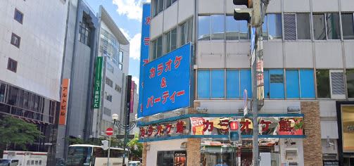 通りを直進していると、右手にカラオケ店の青い看板が見えてきます。看板を目印に右に曲がってください。