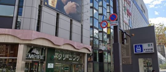 駅を出ると、大きな看板があるビルがあるので、その間の通りをずっと直進します。