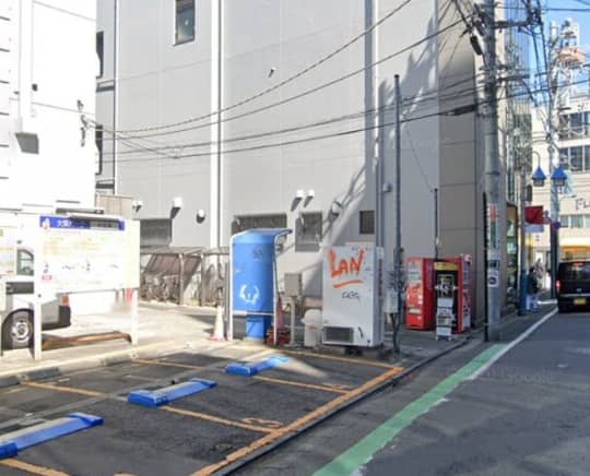 左手にある飲食店や風俗が入っている「甲羅ビル」のB1階に店舗がある。
