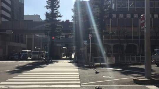 横断歩道を渡り直進し、丸いビルと大阪マルビルを直進し横断歩道を渡り右折します。