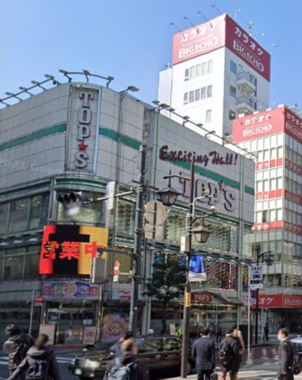 駅の出口を背中にすると、正面にはパチンコ店とビッグエコーが見えます。