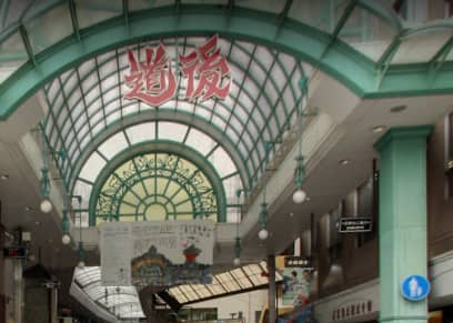 駅を降りたら、すぐ目の前にある「道後」と書かれたアーケード街の中へ進もう。