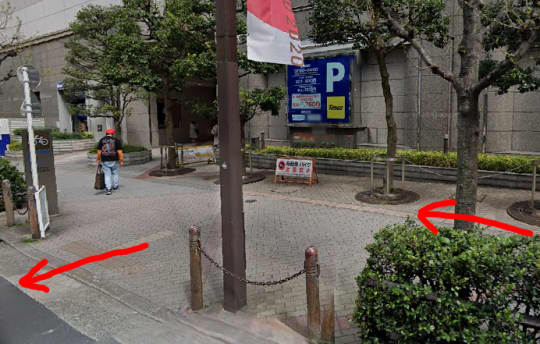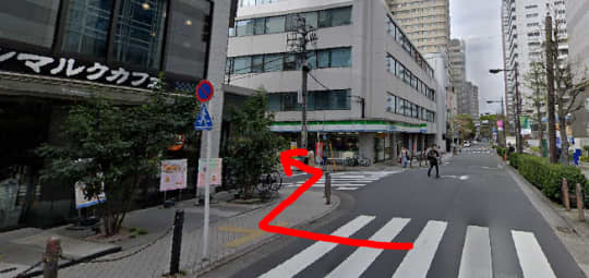 赤い矢印のように、横断歩道を渡って、サンマルクカフェとファミリーマートのところを左へ曲がります。