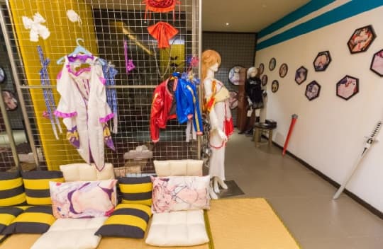 こちらはアニメ衣装の部屋ですね。壁に立てかけられた剣や、枕カバーのデザインにもご注目ください。