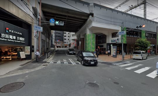 京阪交番前交差点を青信号の方向へ直進する。