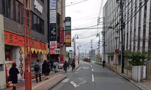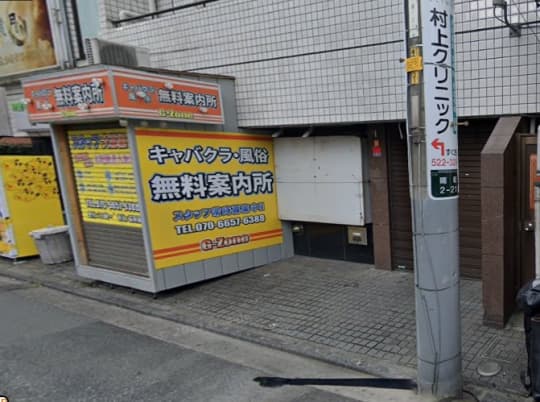 真っすぐ進んで右手に黄色の無料案内所の看板が見えたら、その隣がキャンパスガールだよ。(画像ではシャッターが下りていますが、営業時間内に行けば看板が出ている)
