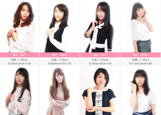 「在籍一覧」「出勤情報」「ランキング」のページを参照すると、女の子の雰囲気の写真・年齢やスリーサイズが公開されている。