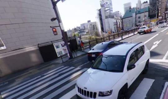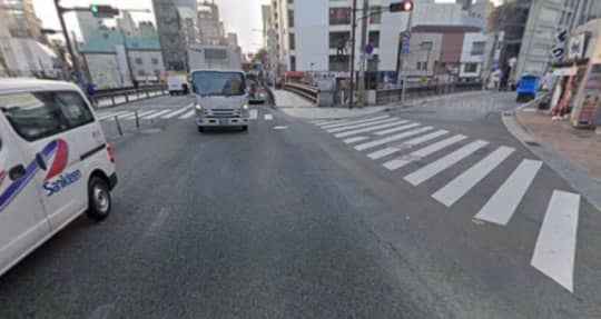 直ぐ左の横断歩道を渡って右へ真っすぐ。橋を越える。