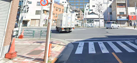 大通り沿いを進んでいくと左手に『今井商会』の看板が見えてくるので右手にある横断歩道を渡ろう。