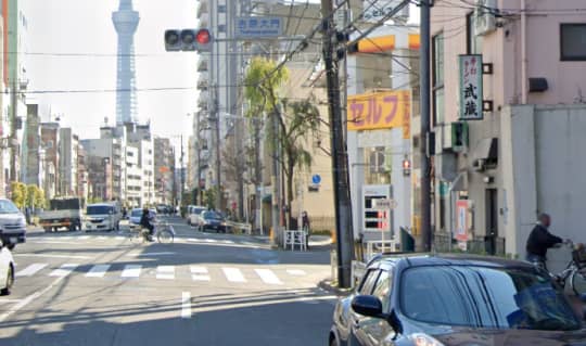 明治通りから「三ノ輪二丁目」の標識のある交差点をまだ真っ直ぐ進み、「土手通り」を真っ直ぐ進みます。