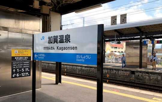 ①加賀温泉駅で下車しよう。直接お店に行く場合は送迎車を利用するといいね。