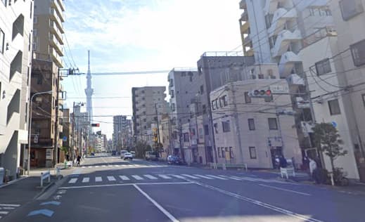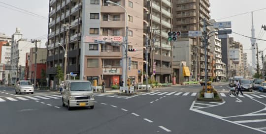 土手通りを進んでくると、日本堤一丁目の交差点が見えてきます。