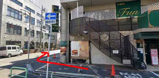 すると右側に、緑色の看板に「岩盤浴ファン」という建物があるので、右へ曲がります。