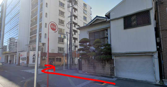 そしたら、右側にある焼き肉屋「大松屋」の手前を右側に曲がり、さらに直進します。