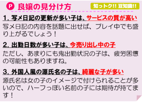 女の子によってマッサージの上手さにバラツキがあります。また実際の女の子の雰囲気が写真と少し違うことがあります。